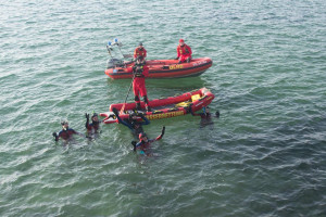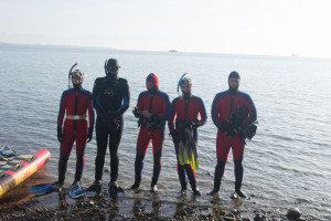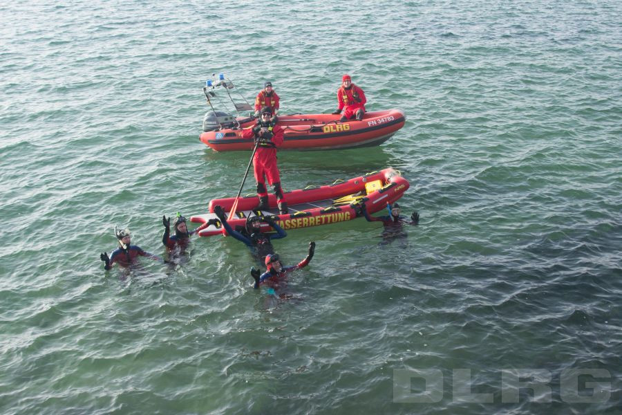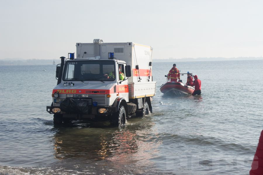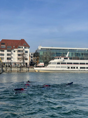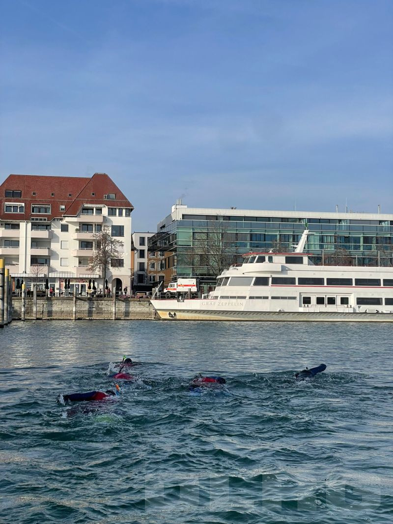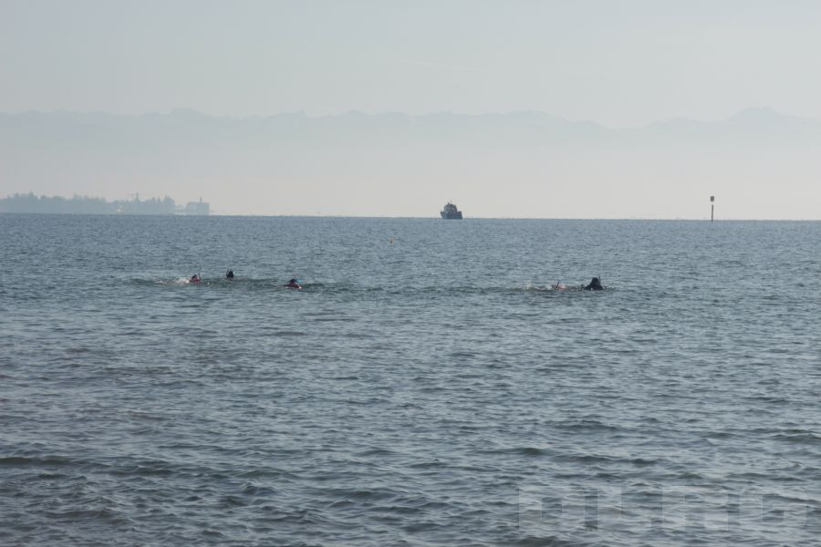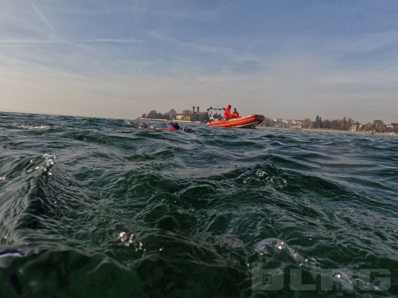 Vor schönstem Bergpanorama und Sonnenschein wurden die Schwimmer an Land von zahlreichen Zuschauern auf ihrer ca. 1,5 Kilometer langen Strecke bis in den BSB-Hafen Friedrichshafen begleitet. Ausgestattet mit modernen Neoprenanzügen, Tauchermaske, Schnorchel und Flossen waren auch die knappen Wassertemperaturen von ca. 5 °C auszuhalten, berichteten die Schwimmer anschließend einstimmig. Ein besonderes Training haben die aktiven Einsatzkräfte dafür nicht bewältigen müssen, „wir sind das ganze Jahr über im Training und brauchen daher keine gezielte Vorbereitung.“